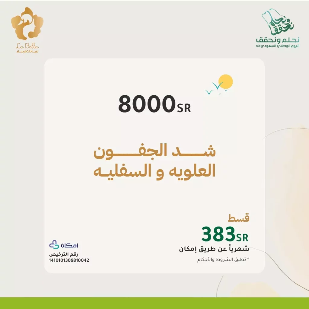 يوم التأسيس هو فرصة فريدة للاحتفال بالجمال والشباب، ونحن في عيادات الجراحة والتجميل “لابيلا” نسعى جاهدين لمساعدتك في تحقيق إطلالة شابة وجميلة. انضموا إلينا واستفيدوا من هذا العرض الاستثنائي.